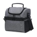 Descrição: Bolsa térmica dupla de nylon com três compartimentos, capacidade de 12 litros. Contém dois compartimentos térmicos isolados, sendo o principal com costura soldada (não vaza). A bolsa possui alça de mão com pegador plástico, bolsos laterais em malha e acompanha alça transversal.