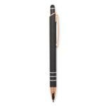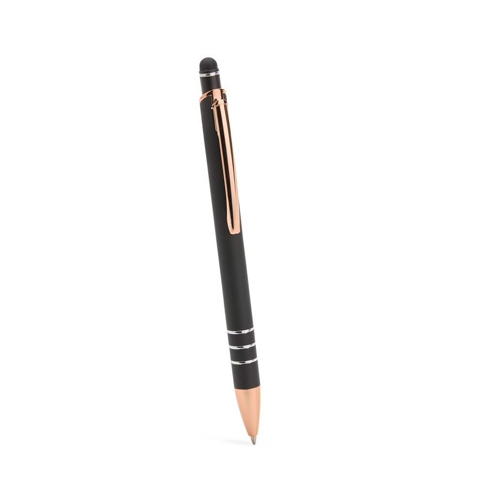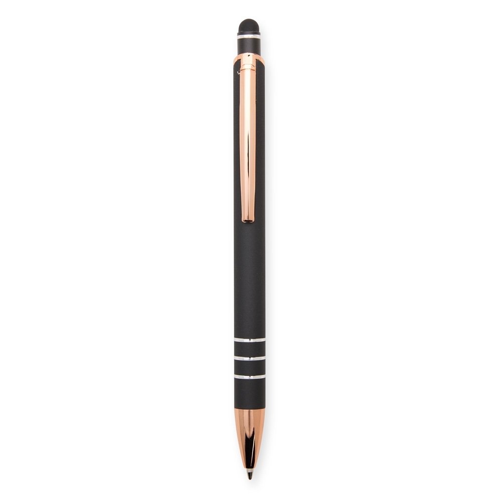 Descrição: Caneta metálica com carga esferográfica azul de 1,0mm e acionamento por clique com acabamento emborrachado para interação em dispositivos com tela sensível ao toque.