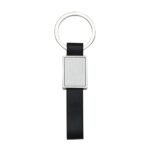 Descrição: Chaveiro em metal de formato retangular com chapa frontal com bordas destacadas e verso inteiramente liso. Dispõe ainda de alça em couro sintético e argola de ferro niquelado, uma em cada extremidade.