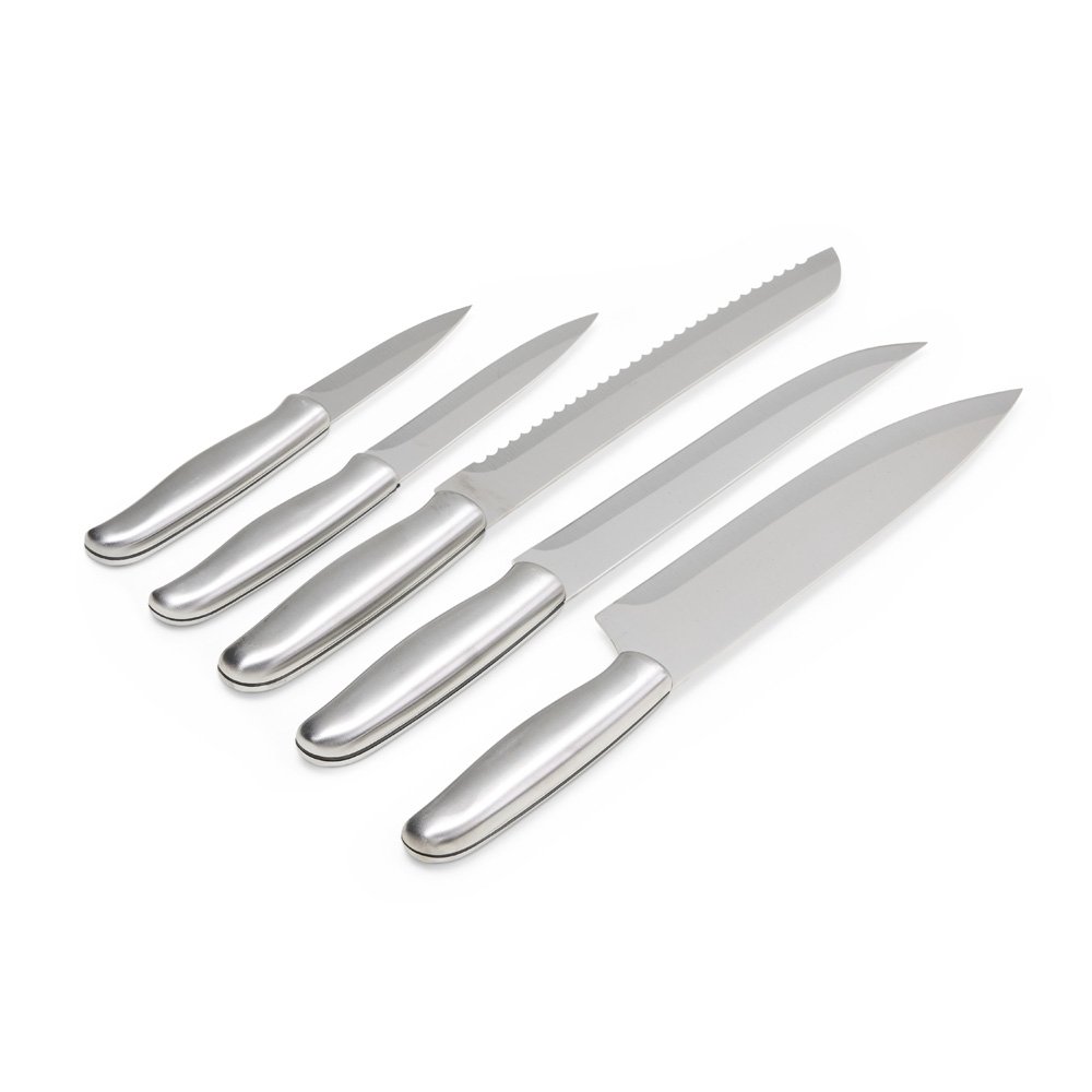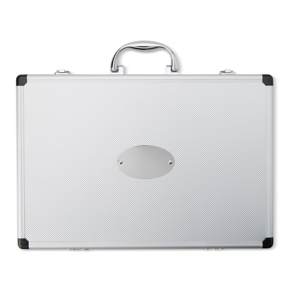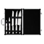 Descrição: A solução ideal para quem valoriza qualidade nos cortes e organização na cozinha. O kit inclui 5 facas em aço inoxidável, com diferentes tamanhos, perfeitas para uma experiência gourmet. Acompanha uma maleta de alumínio texturizado, com interior revestido de veludo e duas travas que garantem maior segurança. Além disso, a maleta oferece espaço para personalização, tornando o kit ainda mais exclusivo.