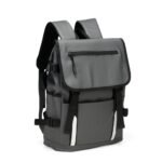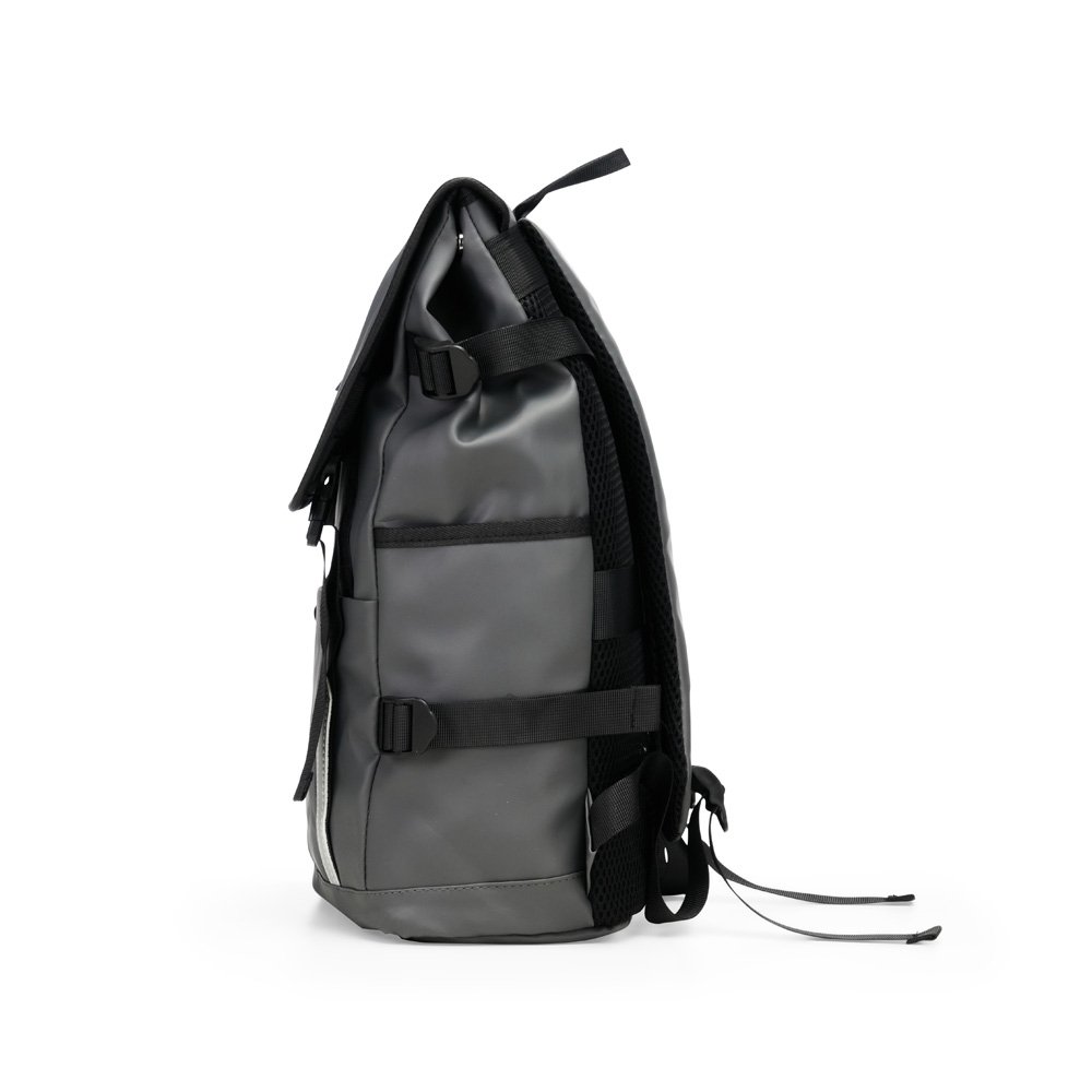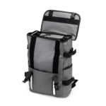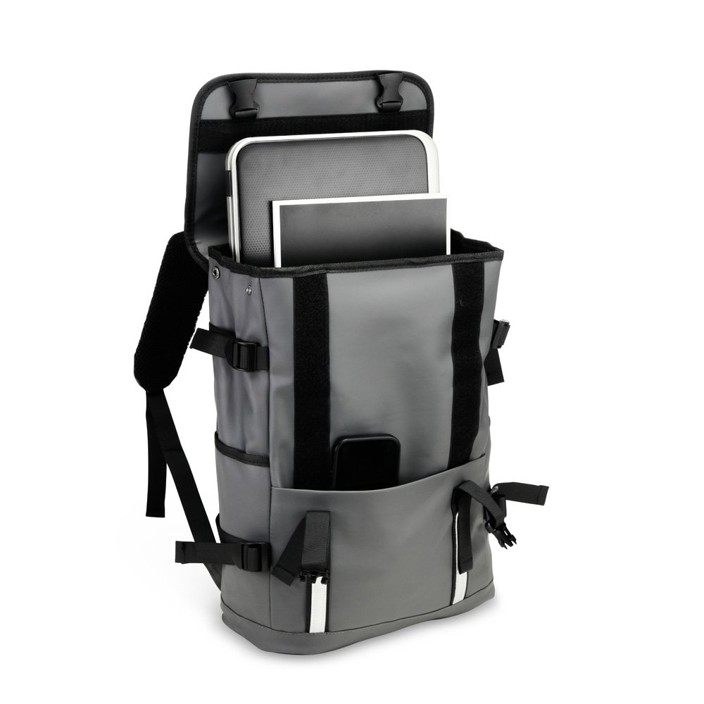 Descrição: Mochila confeccionada em couro sintético com capacidade máxima de 18 litros. Possui abertura com zíper, tiras frontais em velcro e engate rápido. Apresenta divisória interna para notebook de até 15,6 polegadas, além de dois bolsos laterais e dois frontais, sendo um com fechamento em zíper próximo à abertura. Conta ainda com alças ajustáveis, costas acolchoadas em espuma respirável e engate traseiro para malas.